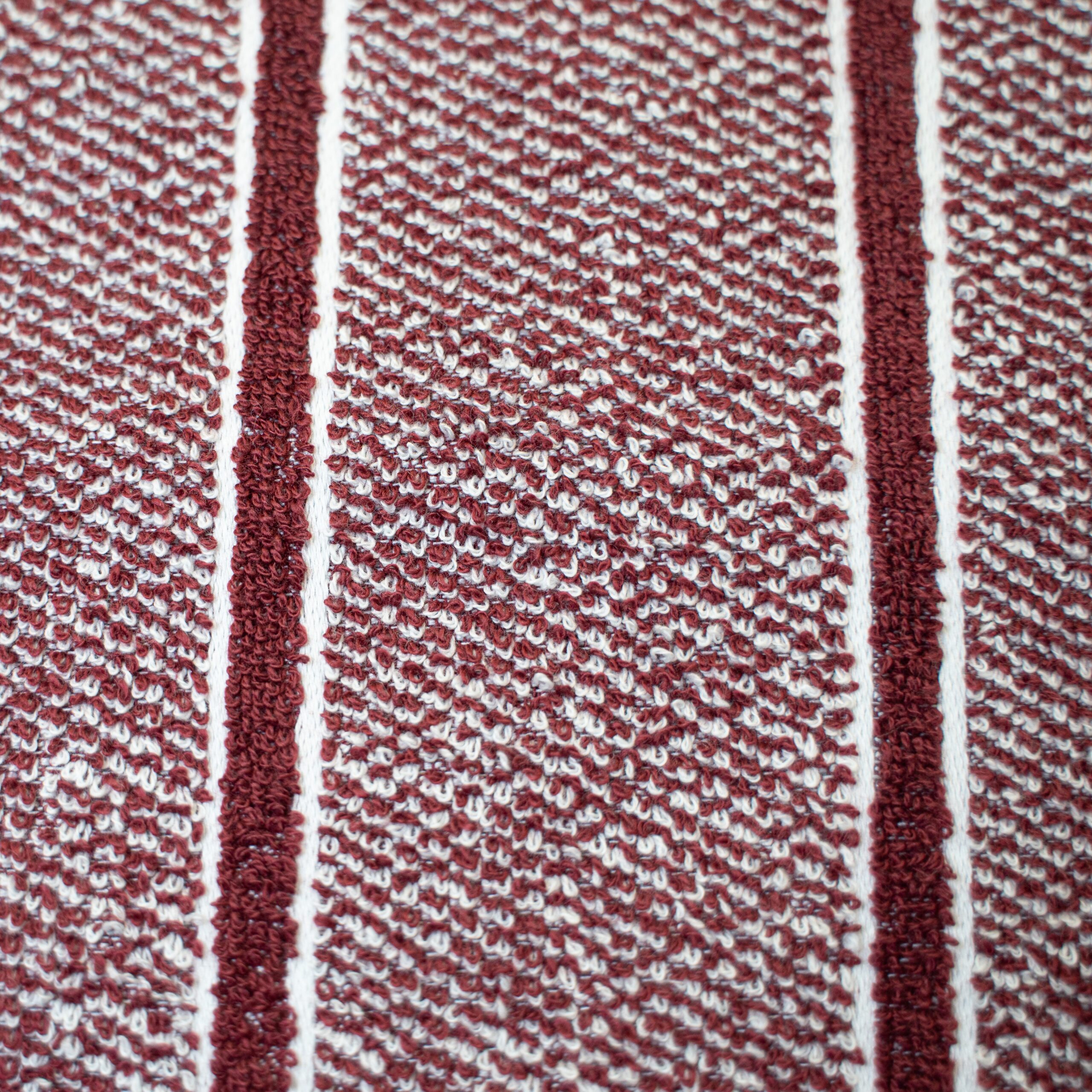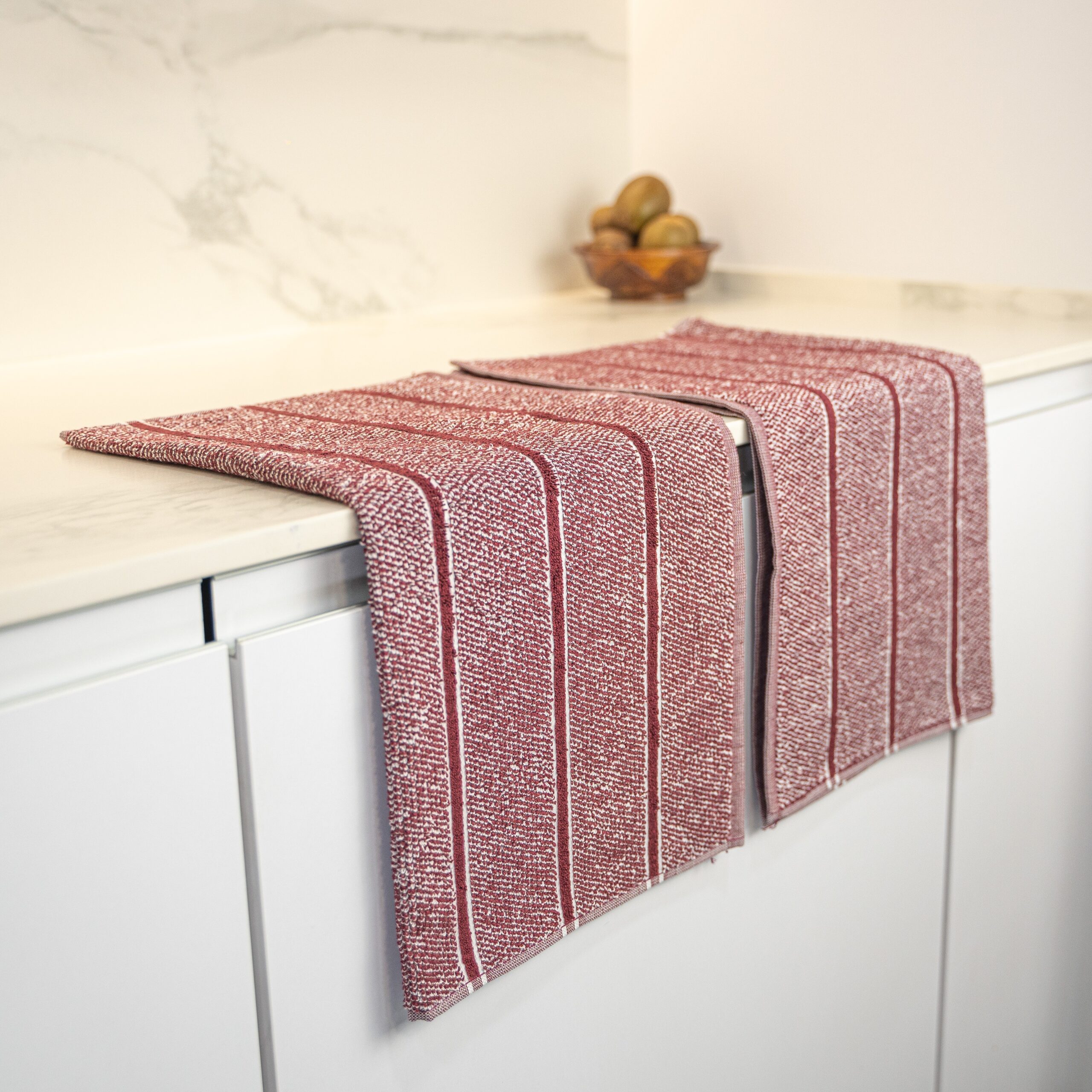 Paño de cocina de rizo, con franjas de color cereza. Suave y muy absorbente.